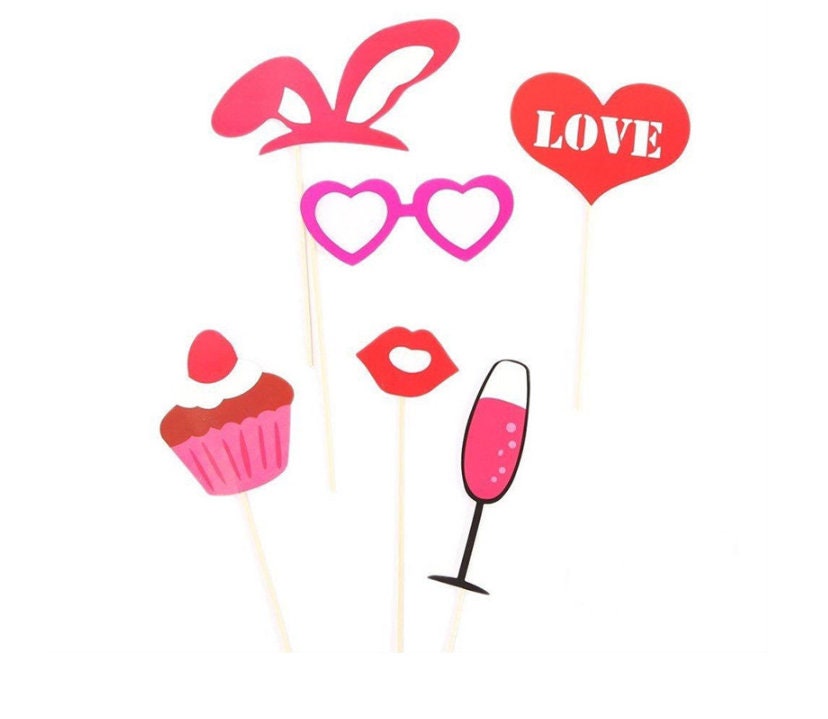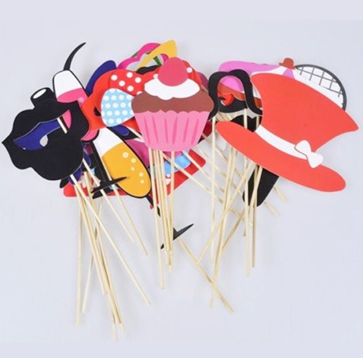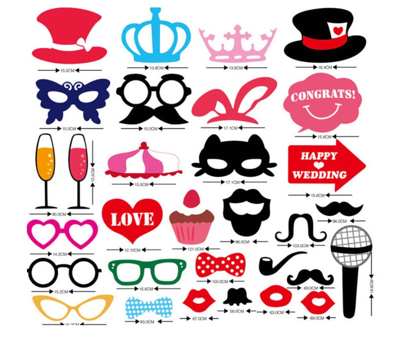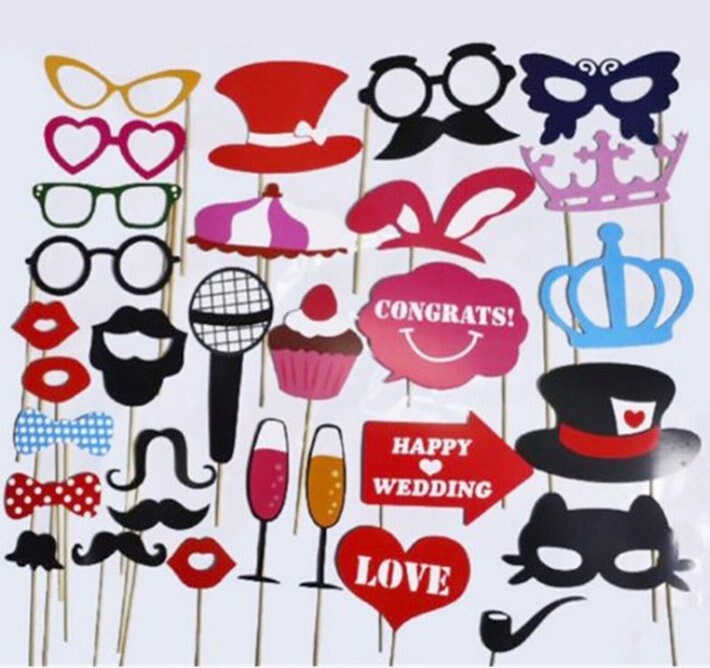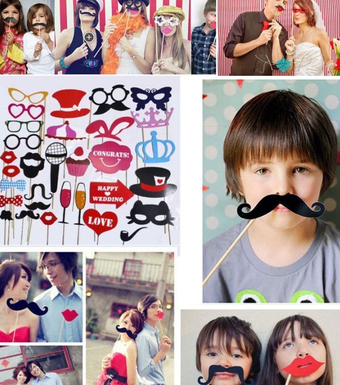 This set of photo booth props contains a variety of different expressions and items that should help make your wedding or party photos a lot more fun.