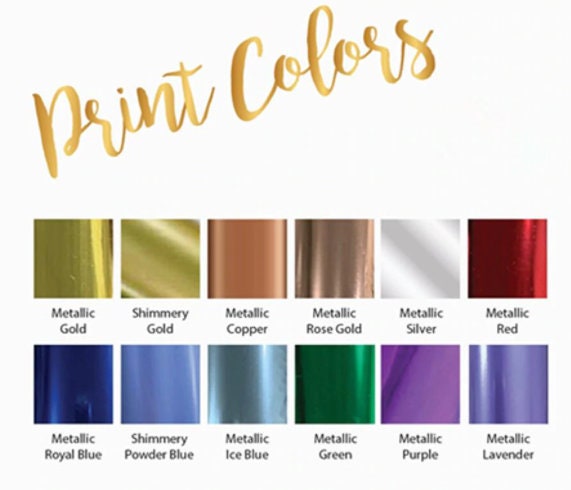 Font Colors (See Second Photo): Metallic Gold, Shimmery Gold, Metallic Copper, Metallic Rose Gold, Metallic Silver, Metallic Red, Metallic Royal Blue, Shimmery Powder Blue, Metallic Ice Blue, Metallic Green, Metallic Purple, Metallic Lavender