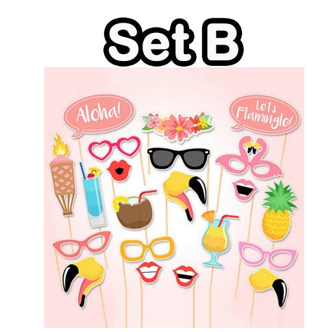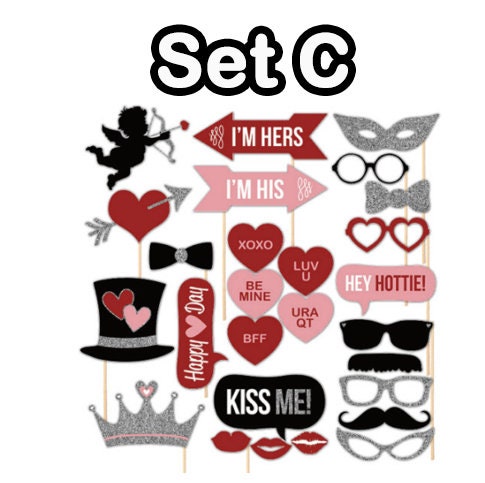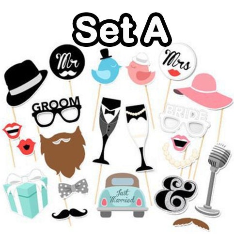 This set of photo booth props contains a variety of different expressions and items that should help make your wedding or party photos a lot more fun.